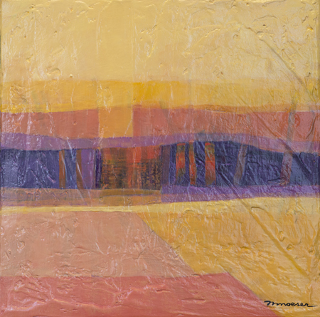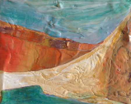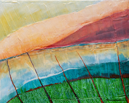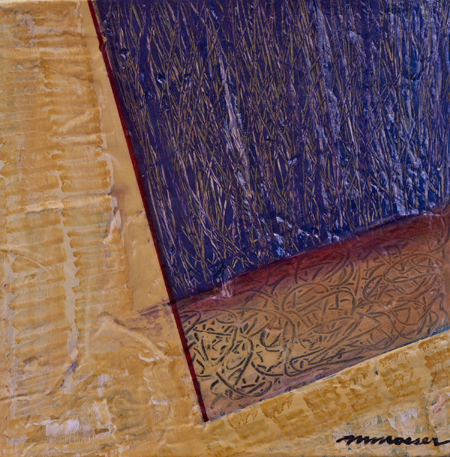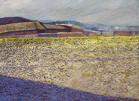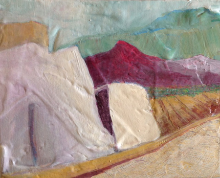 My colours remain highly influenced by the light in New Mexico. Days in New Mexico are crystal clear. I can look out across miles of open fields toward the mountains. Vast open spaces are everywhere. Sunrise is often soft. Colours are often muted. Sunsets are warm and intense, filled with chiaroscuro (light-dark contrasts). To express this dramatic contrast, I often scratch or carve through built-up painted layers, conveying not only the rhythms of the land surface; but also the exaggerated sense of 3-d, as in a bas-relief.