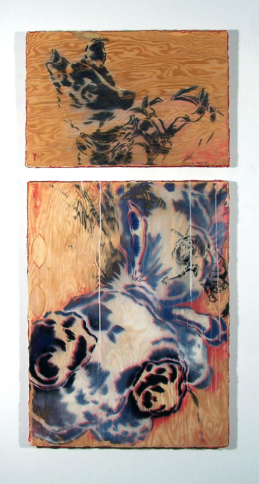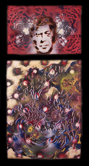 And so McClyment has memorialized this true turning point in a suite of hotly coloured paintings of the artist’s recollections from that galvanizing year. Employing his trademark stencil process (he draws his images on paper, cuts them out and makes them into stencils, and then spray-paints them onto prepared plywood panels), McClyment juxtaposes images in such a way that the smaller panel at the top of a work may or may not enrich or amplify what is in the bigger painting below it.