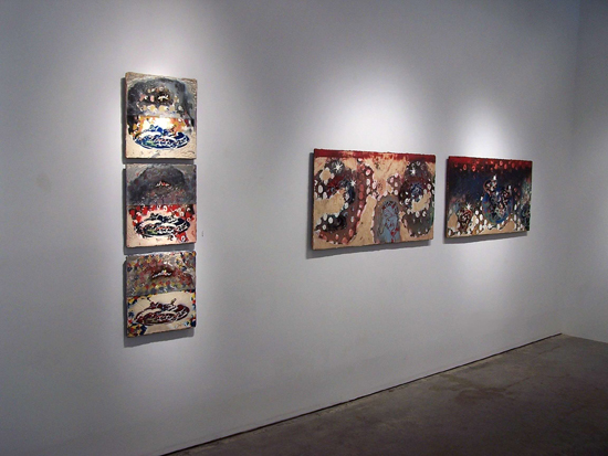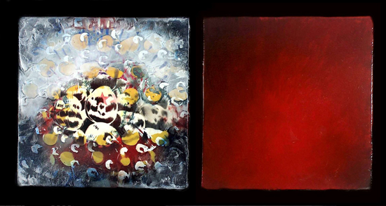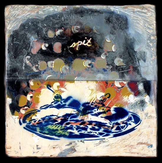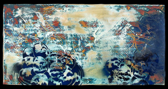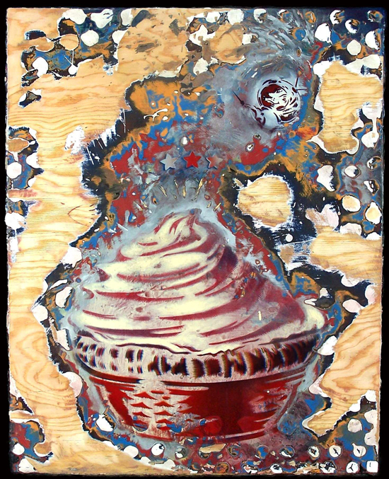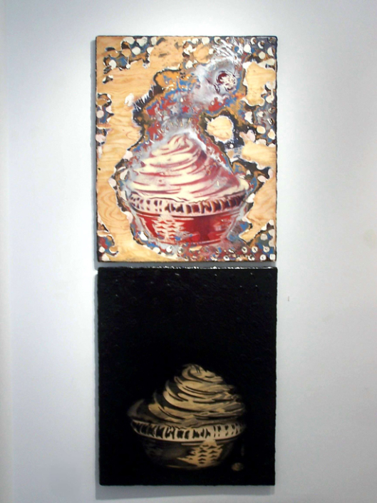 “Abundance” explores food related imagery and the “politics” of food. These paintings use the seductive gloss of food “porn” sources like Gourmet or the LCBO magazines as starting off points. The images are meant to be media representations of food – a parody of the real thing. The “reality” of the pitted and distressed surfaces contradicts the appeal of polished settings and saturated colours. There is a comfortable, familiar feeling to these images. Yet they never resolve into anything truly recognizable. Being undefinable, they remain unattainable.