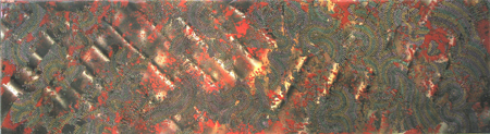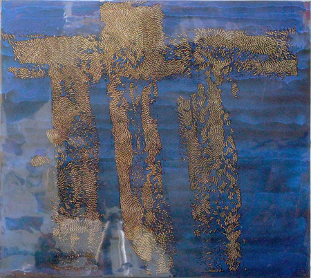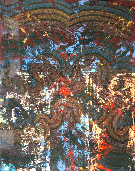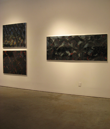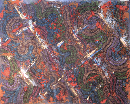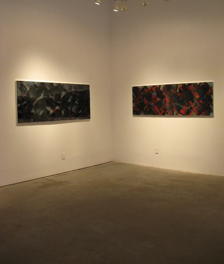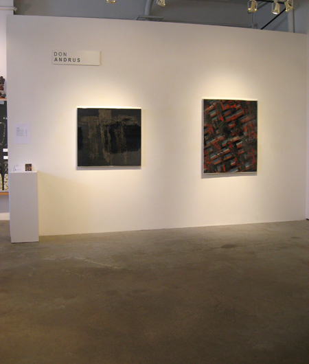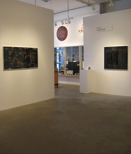 “In these works the small marks painstakingly applied with gel pen float over the ground. This is accomplished by sandwiching the marks between two layers of clear resin. The effect is both mysterious and uncanny; the small marks, deliberately applied seem to spell out a Morse Code. They flow rhythmically over the painting, folding, turning and transforming…. The mixing of traditional and unconventional materials and techniques reflects Andrus’ questioning of the historical inevitability of the modernist/formalist develoment of abstraction.” (Jon Tupper, Director of the Art Gallery of Greater Victoria)