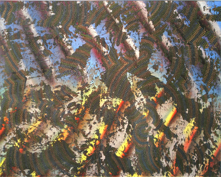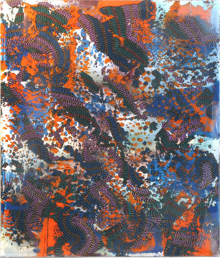 The ongoing series of paintings titled FIELD, is one in which the qualifying animus is based, in part, upon the patterns and rhythms of the images within each painting and, in part, upon the personality of the materials and processes involved in the making of the work. The open-ended mobility of the patterning created through the repetition of minute touches of colour acting within the cloud-like grounds, together with a highly reflective surface, all aspire to create a constant shift, a kind of essentialist kinesis.