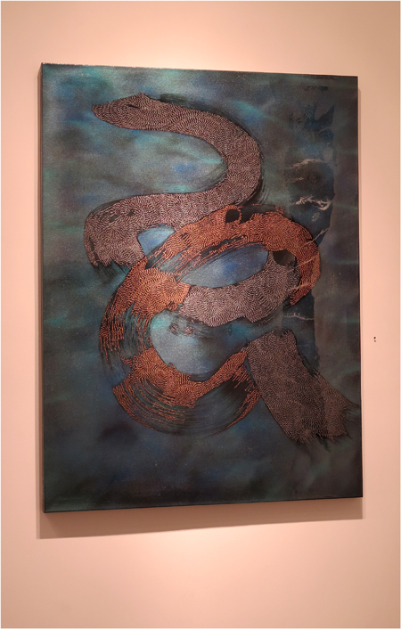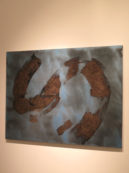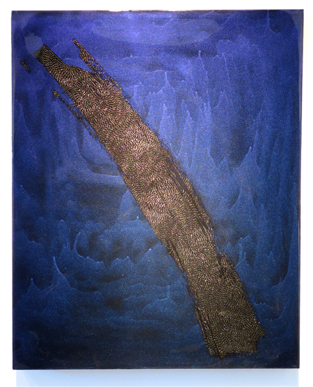 Donald Andrus, COPPERED SWEEP, 2015, colour shift paint, gel pen, fresco, epoxy resin on canvas, 36 1/4 X 28 5/8 in.