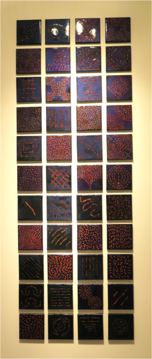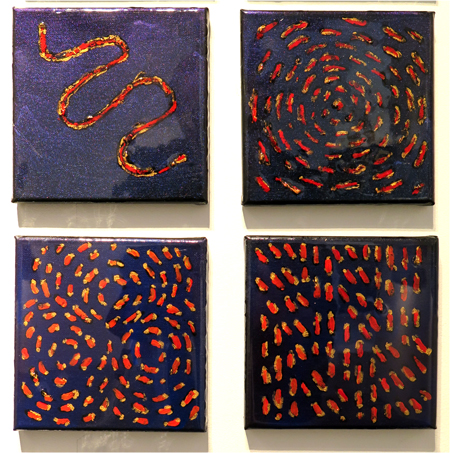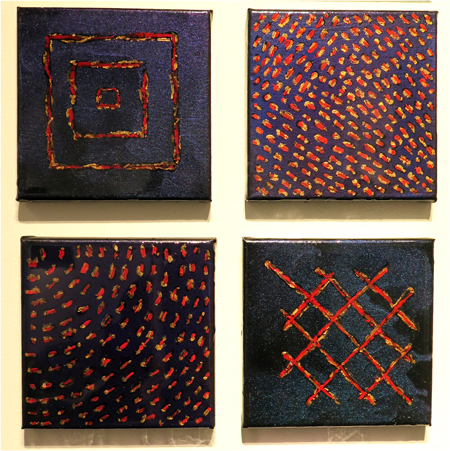 Donald Andrus, CICATRICES, 2015/16, dupli-color, colour shift paint, acrylic, oil, fresco on canvas, 44 - 6 in. squares/ cic·a·trix ('sik?,triks) noun: cicatrice- the scar of a healed wound; a scar on the bark of a tree. BOTANY: a mark on a stem left after a leaf or other part has become detached.