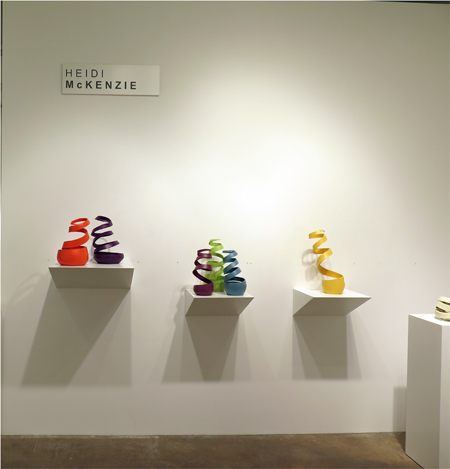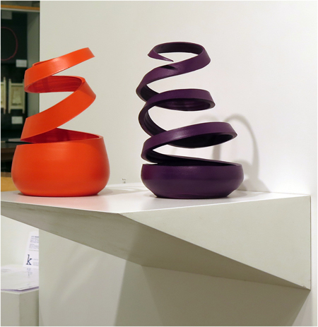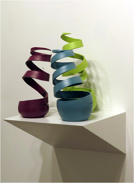 I work in two different palettes or “ideascapes”: tonal and primal. The tonal draws on the variegated hues of raw clay bodies, while the primal is based on the colour-wheel’s saturated pigments. My shapes also draw on two opposing ideas: linear curves and basic solid three-dimensional forms; bands of thrown and altered clay, coaxed into kinetic rhythm versus foundational geometry.