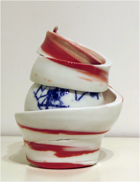 China Bound is a series of work that reflects the duality of China that I experienced during my artist residency in Jingdezhen, 2013. Much of the country seems intent on aspiring to hyper-capitalism, while at the same time the soul of the country – its tradition – refuses to be quashed. In this series I try to capture what I believe to be at the core of this duality. Placing the forms in asymmetry at the centre of the altered vessels speaks to the caveats placed on freedom and innovation, where tradition is encircled and bursting with new energy.