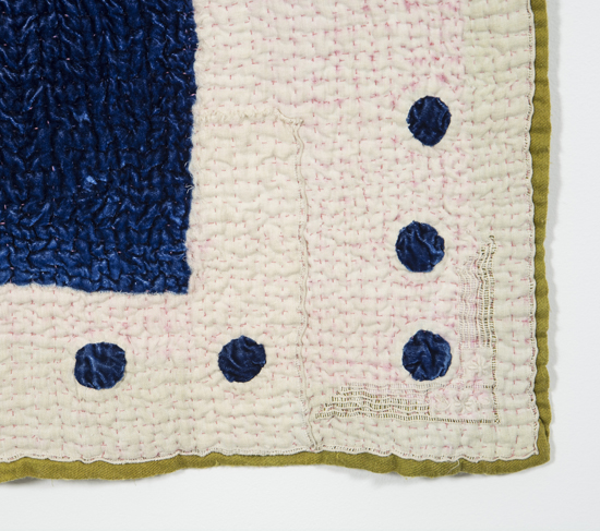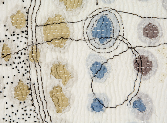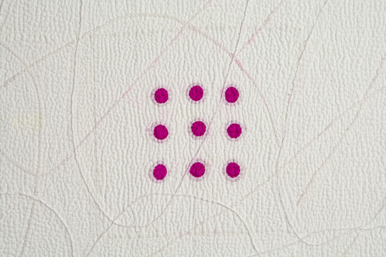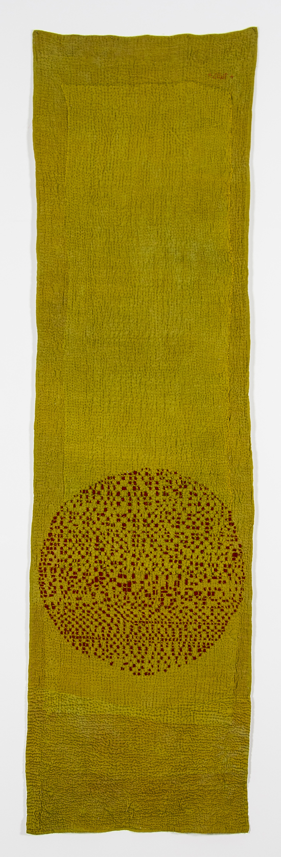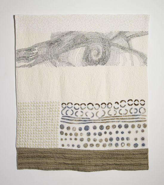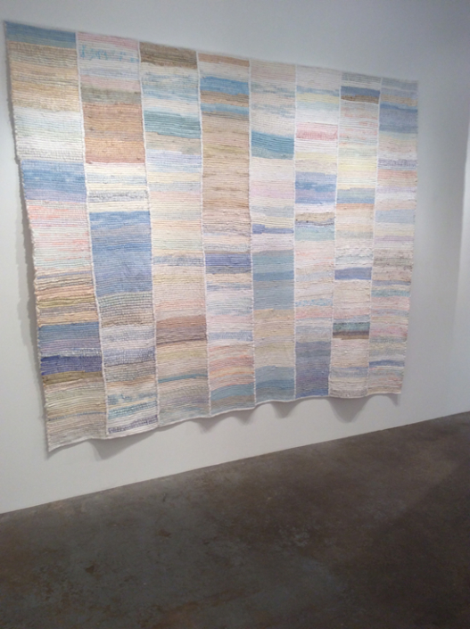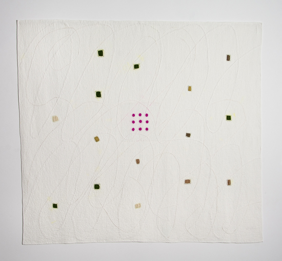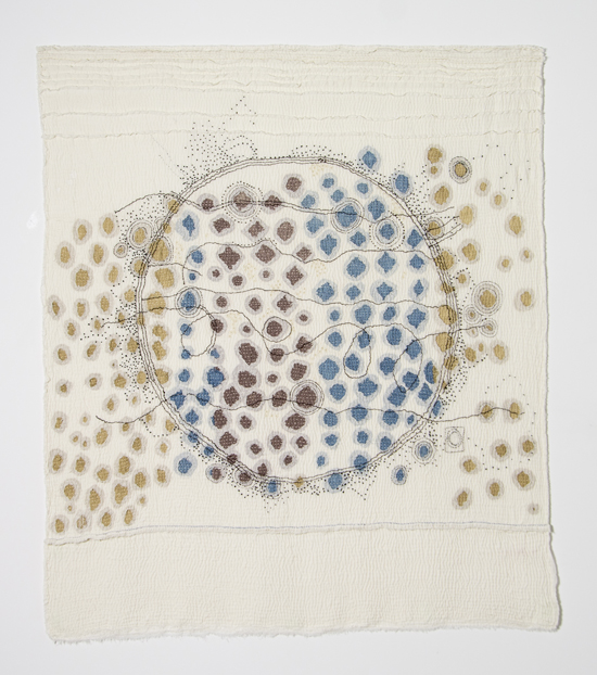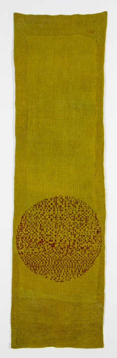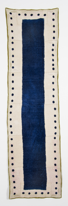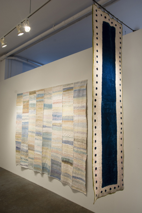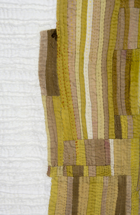 I prefer to make large stitched textiles, larger than anyone can reach in any direction. Although these have what might be termed a minimalist aesthetic, they are made up from many unique small hand made parts that seem identical, but are not. Both sides of my textiles are the right side. My preferred materials are plant dyed wool, silk and vintage domestic linens.