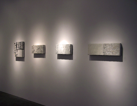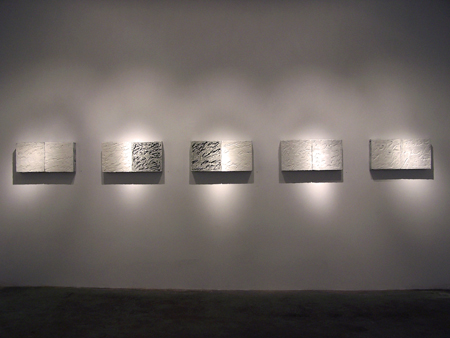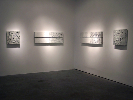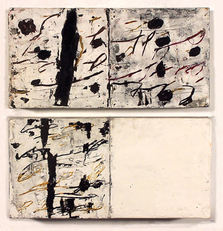 The following review, in the fall 2007 issue of the Hudson Review, by New York-based art critic Karen Wilkin, of a previous exhibition by Katja Jacobs, could have also been written about this current exhibition. In it she writes that, “… the German-born, Toronto-based painter, Katja Jacobs showed a group of her powerful, near-monochrome palimpsest images. Jacobs, whose work I have admired and whose evolution I’ve followed for almost thirty years, treats her canvases as over-sized diaries, responsive “fields” on which she records her deepest obsessions, “writing” them in alphabets we cannot read but that nonetheless speak clearly to us. She creates walls of marks that drift in and against dense, creamy expanses, sometimes obscuring what she has “written” with overpainting or collaging, and sometimes re-excavating hidden “messages.” Like imperfectly retained memories, Jacobs’ configurations often seem to be on the verge of yielding up a precise meaning but dissolve into abstract lines, scrawls, and touches, the more closely we study them, without, curiously enough, losing any of their aura of alluding to something important. Sometimes, she pairs related works as diptychs, making us acutely aware of both likenesses and differences between them. They are some of the most haunting and visually arresting paintings I am aware of.