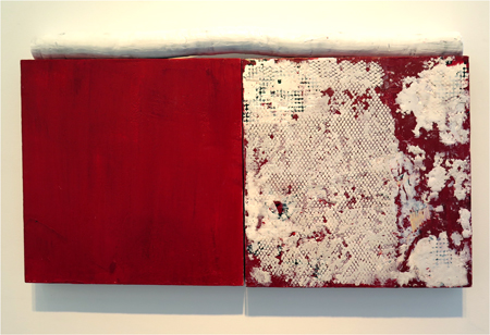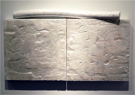 Katja Jacobs, Traces of Words #3, encaustic on wood panel and stick, 13 1/4 X 24 in.