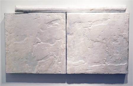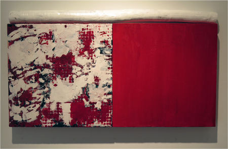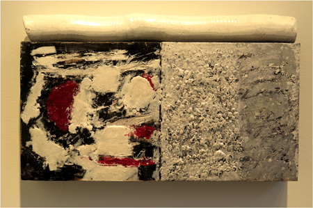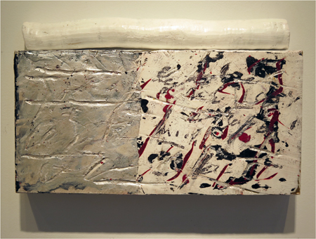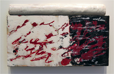Katja Jacobs, Traces of Words #17 encaustic on wood panel and stick, 13 1/4 X 24 in.