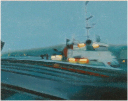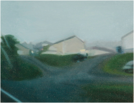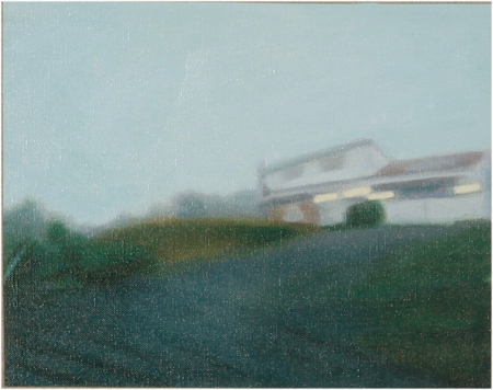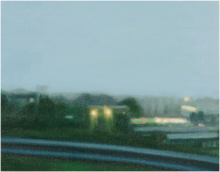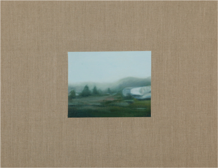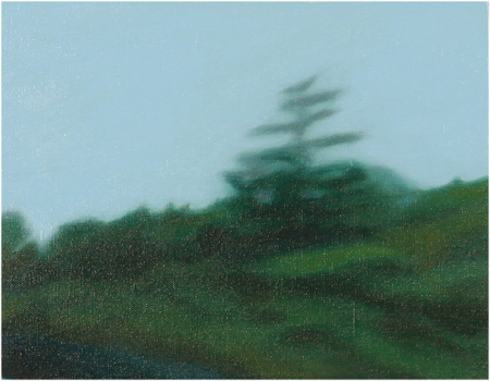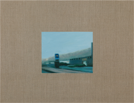 The source imagery for this series was a sequence of un-composed photos I took as a back-seat passenger on a family road trip in St. John’s, Newfoundland in the Summer of 2015. We travelled extensively in this way so my sister could see the landscape she had limited access to in her wheelchair. On this drive through the rain, drizzle and fog-soaked landscape from Cape Spear down into the city’s harbour, a non-majestic view flashed by with limited distinctions in a blue and green-grey palette. This work reflects on both still photography and landscape painting in a day and age when our only relationship to much of what we see is the view from a moving vehicle or screen. Short tough Spruce skids by in blurry images from the countryside as it transforms though more and more development heading into the city. Soon the beginnings of human construction and consumption appear and the edge of suburban interventions starts to dispel the greenery. Finally, warehouses for storage of all that comes through the busy port unfold before docks, ships and cranes come to dominate the view. With a nod to the diffuse and contemplative landscapes of Gerhardt Richter and early April Gornik, this series is about how paintings allow the opportunity to slow down – and where movement, change and letting go in relation to an experience of the environment, and life, is still beautiful when shrouded in rain, drizzle, and fog.