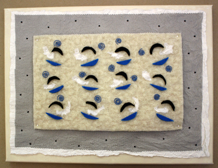 Since studying ballet as a child, I have always been interested in the physical manifestation of music, including the pauses between notes: the unseen and the inaudible. Now that I live by the ocean on the small rural island of Gabriola in BC, I have been drawn increasingly into the music of nature. The dance of the tides, shapes lifting briefly from the waves, telltale spouts of water-infused air. The energy that goes into this work is what I feel as I watch and take all this in. Playing with wool, felt, Washi and wire, I have worked the tides of my shifting moods against the (felt) tidal lines rising and falling along the shore. The work is about building… building texture, building layers and building stories.
