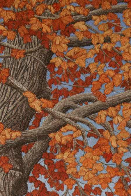 Tracey Lawko, Change Enables Growth (detail: Autumn), 2016, thread, fabric, 40 X 24 in., (quadriptych, 41 1/2 X 88 in.)