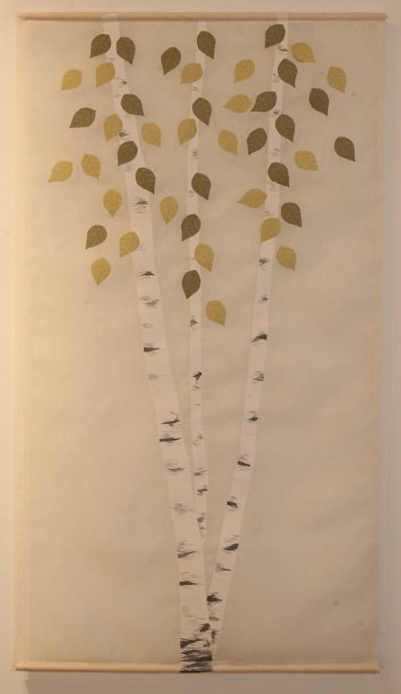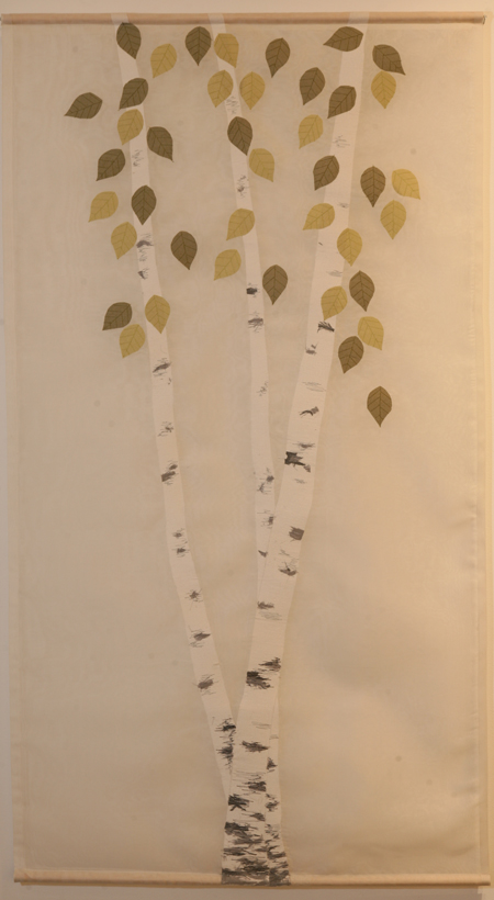 Tracey Lawko, Birch 1, 2016, silk: organza, dupioni, thread, 48 X 26 in., (dupioni- a rough slubbed silk fabric woven from the threads of double cocoons)