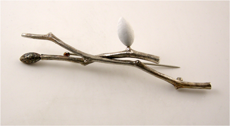 Vivienne Jones, two twigs brooch, 2016, sterling silver, resin, 4 1/2 X 1 1/2 X 1/2 in., SOLD.